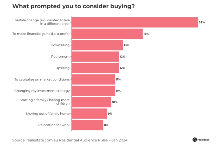 The reasons for purchasing vary, with lifestyle changes such as a desire to live in a different area ranking highest at 32%. Other motivators include making financial gains (18%), downsizing (13%), retirement (12%), and upsizing (12%).
